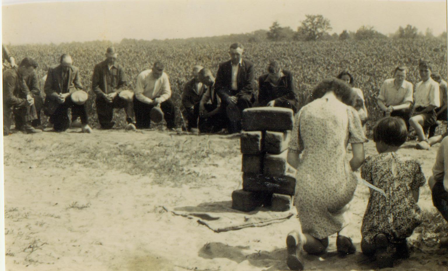 Ter Kuile vervolgt zijn mijmeringen: ‘De uitdeling zal beginnen: Lansink roept luid: "wie begint" (we beginnen) en de andere boeren roepen naar de voor ons fototoestel in de kreupelbosjes gevluchte vrouwen en kinderen: "Der oet, as iej nich hier komt bidden, dan krieg iej niks" (kom te voorschijnm als je niet bidt, krijg je ook niets). Dat helpt: ze komen nader en nu, achter de boeren geschaard, vallen ze tegelijk op de knieën, de petten gaan af, de hoofden buigen zich, de handen zijn devoot gevouwen en de ontroerende stilte, die nu is ingetreden, wordt alleen verstoord door het regengeplas en het gekuch van kinkhoestkinderen. Na enige minuten verrijst de kleine schare en begint de uitdeling, of liever eerst de beraadslaging hoeveel en wat ieder zal ontvangen. Een vertegenwoordiger van het R.K. armenbestuur van Ootmarsum geeft aan de boeren, speciaal aan Lansink, allerlei inlichtingen omtrent elk der vragers: hoe groot de nood bij deze is, hoeveel kinderen die vrouw wel ten haren laste heeft, met hoeveel tegenspoed gindse wel te kampen heeft. Maar Lansink zegt ons later nadrukkelijk, dat de armenverzorger uit de stad eigenlijk absoluut geen zeggenschap heeft en dat het vanouds een zaak der marken alleen is; het brood wordt trouwens ook wel aan de protestantse armen verstrekt, als deze zich aanmelden. Na heel wat overleg worden de broden uitgereikt. ‘